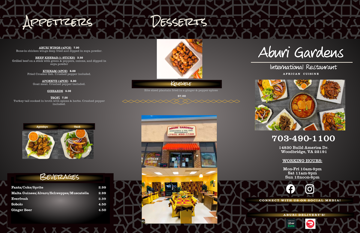 The Aburi Gardens International Restaurant Menu offers a delightful blend of rich flavors and diverse dishes that cater to every taste. Whether you're in the mood for a quick bite or a full meal, their offerings promise to take you on a flavorful journey. Located at 14830 Buildamerica Dr, Woodbridge, VA, this spot is perfect for casual dining, offering everything from savory sushi rolls to hearty entrees. Each dish is carefully prepared with high-quality ingredients, bringing an international flair right to your table. If you're someone who enjoys a mix of traditional and modern takes on global cuisine, this menu won’t disappoint. The variety of options means there's something for everyone, whether you're vegetarian, gluten-free, or just craving a new culinary adventure.