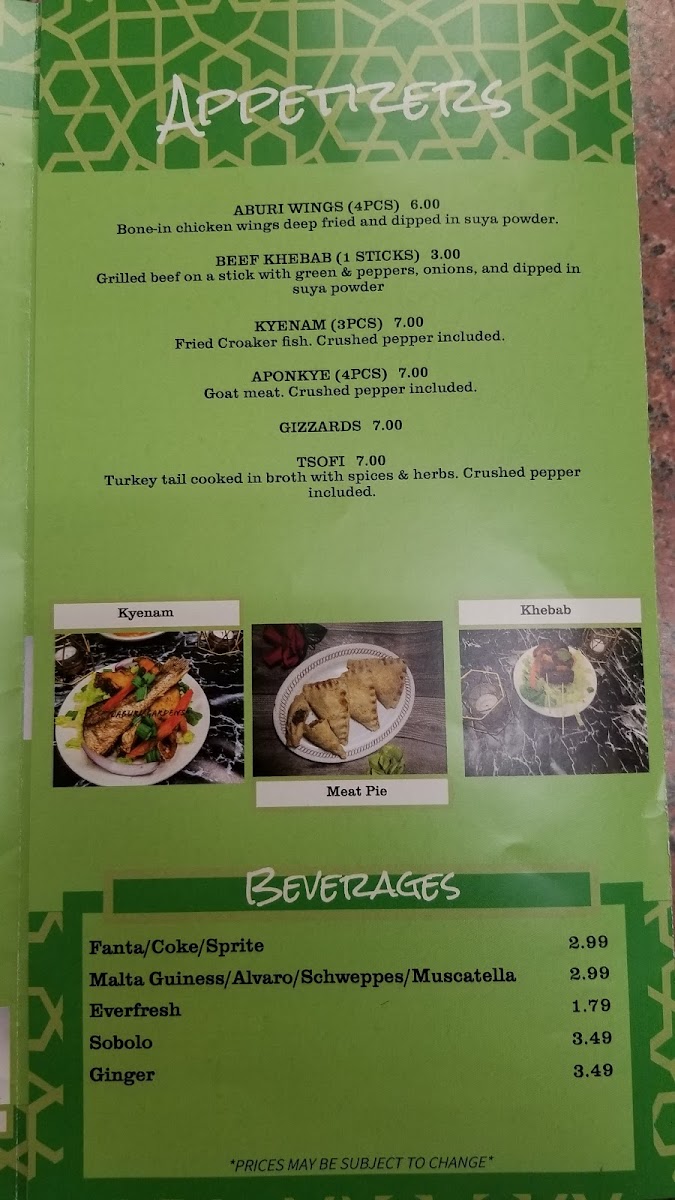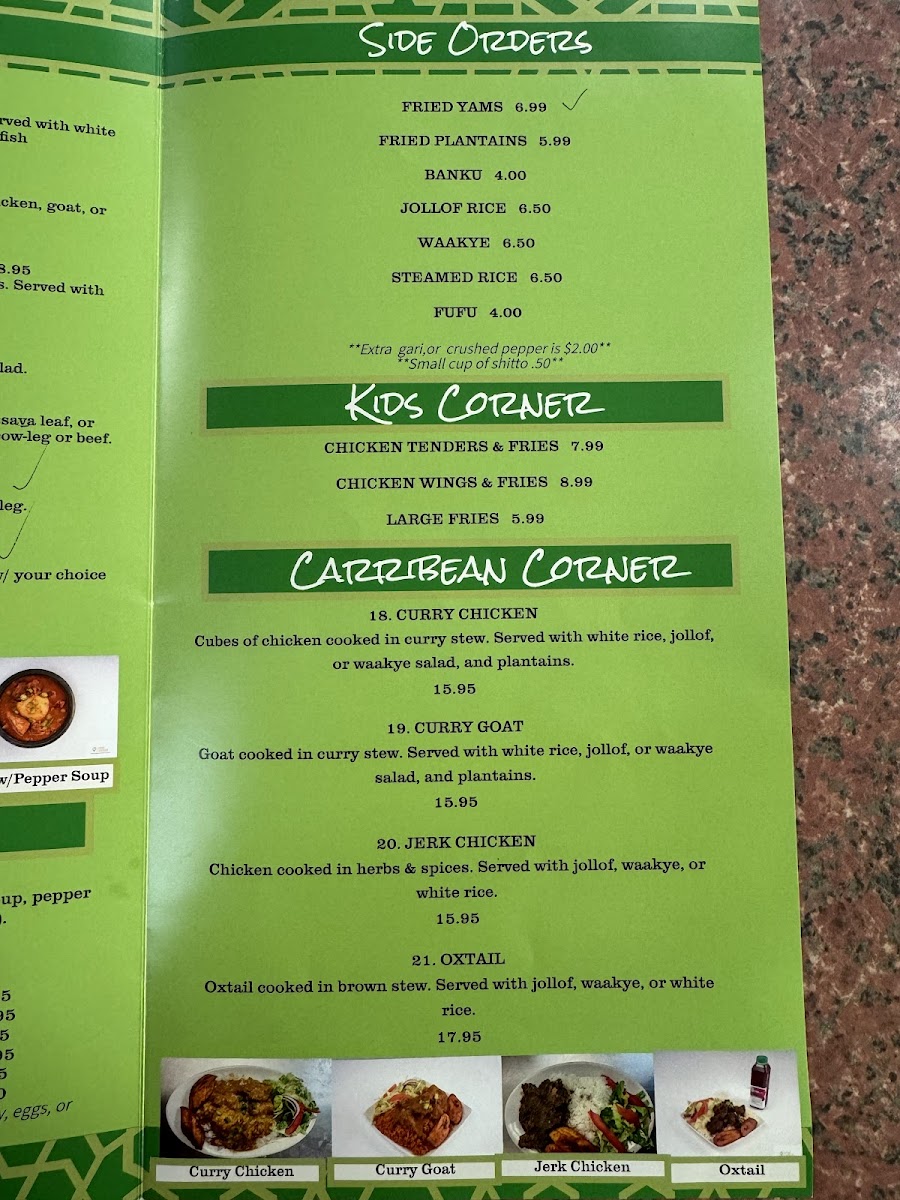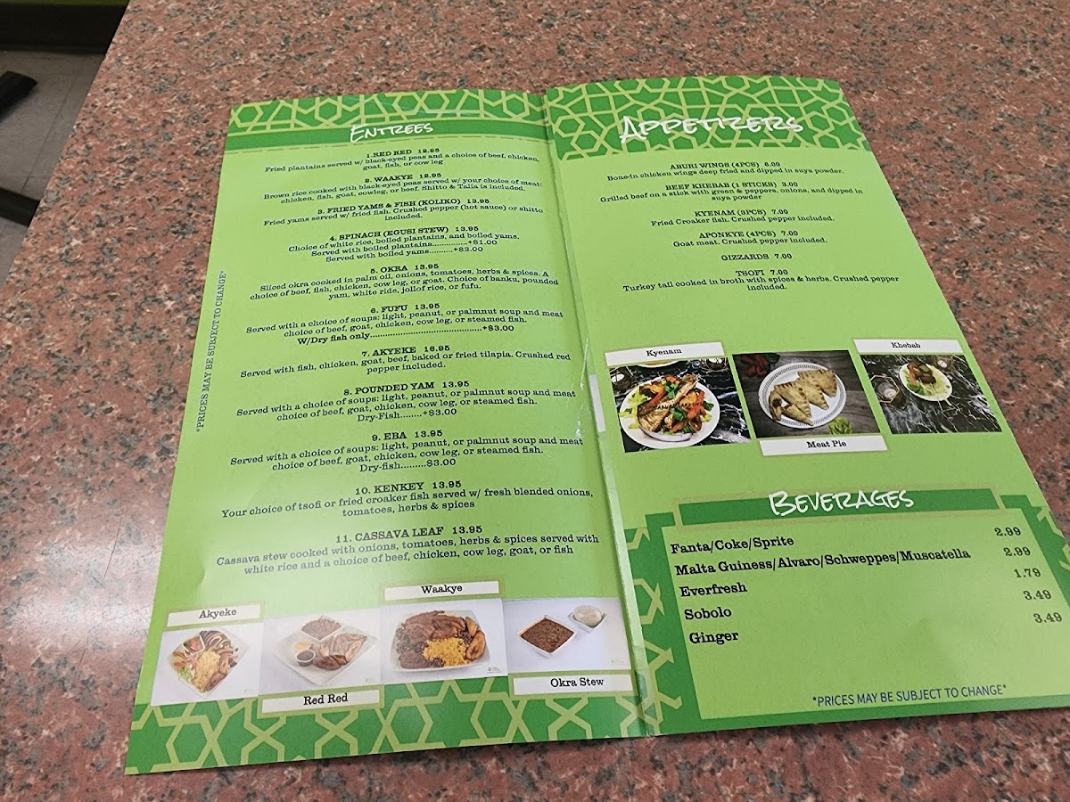A choice of jollof, waakye, or white rice served w/ spinach, cassava leaf, or black-eyed peas. Meat choice: fried croaker fish, goat, chicken, cow-leg or beef.