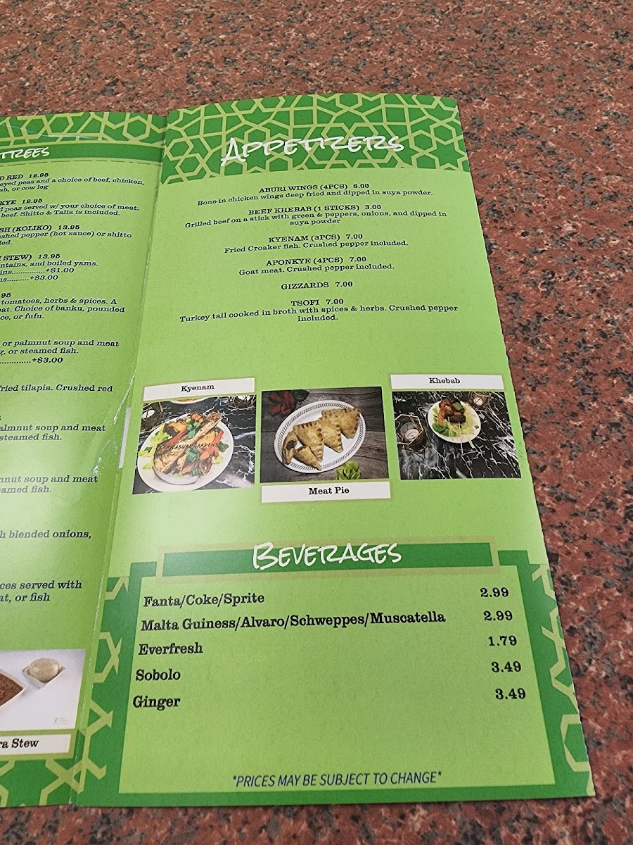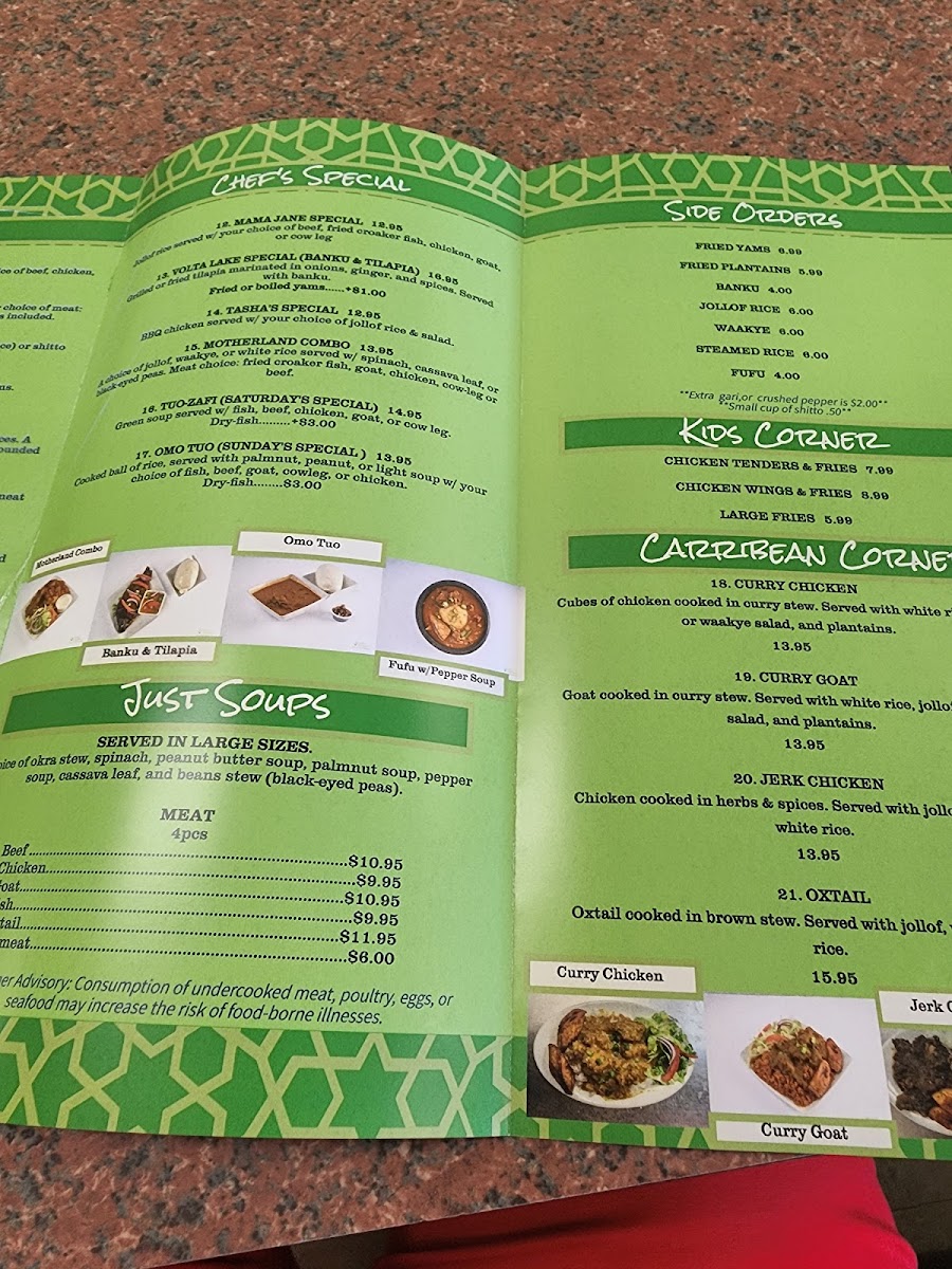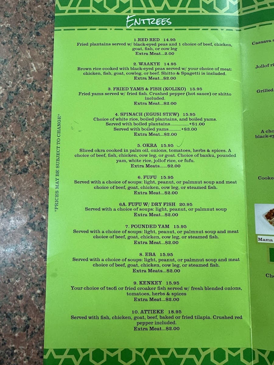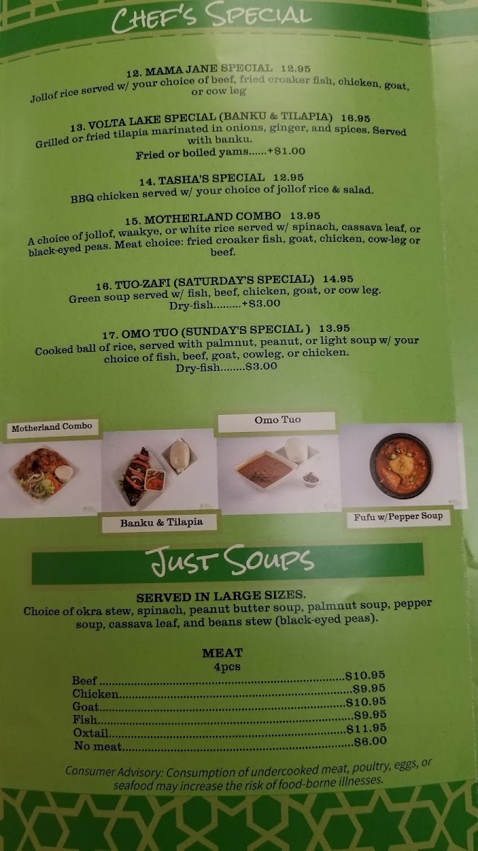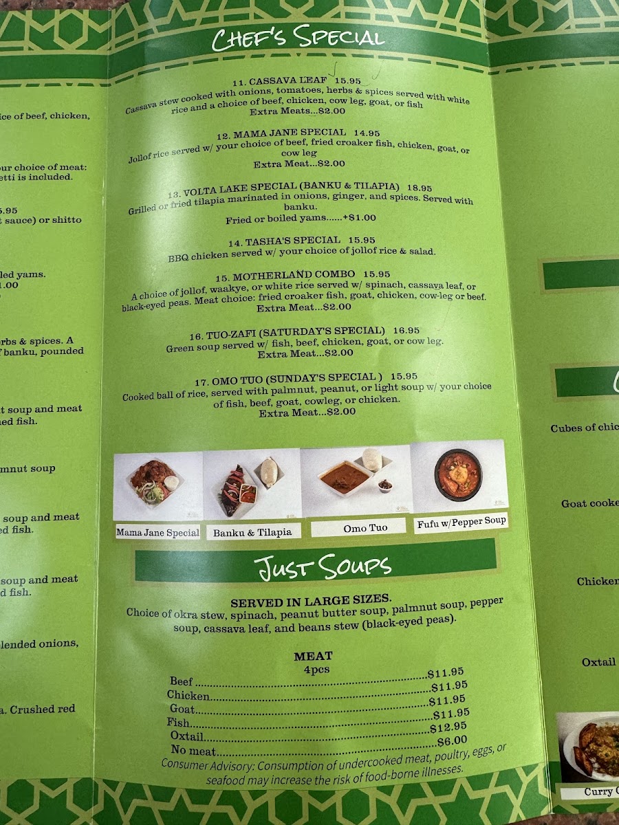Served with a choice of soups: light, peanut, or palmnut soup and meat choice of beef, goat, chicken, cow leg, or steamed fish.